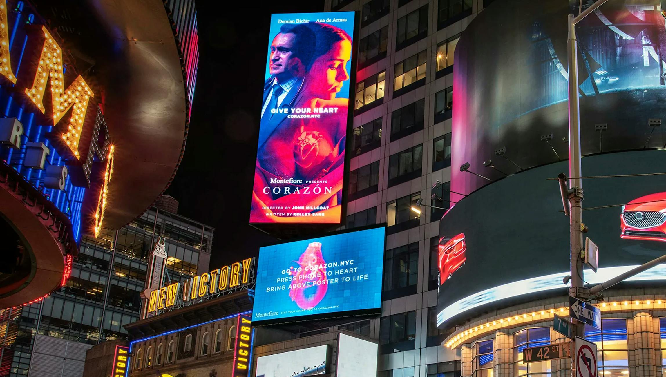 Viewers leaving the film were prompted to press their phones to their hearts, bringing Elena to life on Corazón movie posters and Times Square billboards. After users metaphorically “gave their hearts,” they could register as organ donors with Donate Life America in just 15 seconds.